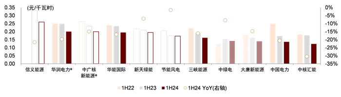注:1)空心框为新能源装机规模低于10GW的电企,虚线柱子为新能源装机规模在10-20GW之间的电企,实心柱子为新能源装机规模高于20GW的电企;2)度电税前利润用新能源税前利润总额除以售电量测算,中广核新能源采用净利润测算(较其余公司多扣除所得税),大唐新能源、中广核新能源仅披露发电量,我们假设厂用电率为3%测算售电量,下同;3)信义能源、中广核新能源原始货币分别为港币、美元,我们采用中金汇率假设及公司公告披露汇率换算,信义能源仅有两个半年度同口径数据。