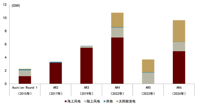 注:括号标注时间为每一轮CfD拍卖结果公布的时间;其中AR4中的部分海上风电项目因后续项目取消或规模缩小等原因,合同没有被实施,相关产能在AR6中再次被开放和支持。统计截至2024年9月20日