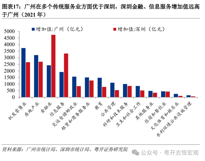 从分行业增加值看,广州偏重传统服务业,深圳偏向金融和信息服务,总体看互有优劣。按照最近可比数据,在14个服务业行业中,广州有12个行业增加值较高,其中交运仓储邮政业、教育业、卫生和社会工作、批发零售业增加值达到深圳的1.9、1.9、1.7、1.4倍,体现广州传统服务业规模较大、功能齐全;深圳在银行、证券、互联网等领域龙头企业较多,金融业、信息服务业增加值分别较广州高出2300亿元、1400亿元,约为广州的2倍和1.7倍。