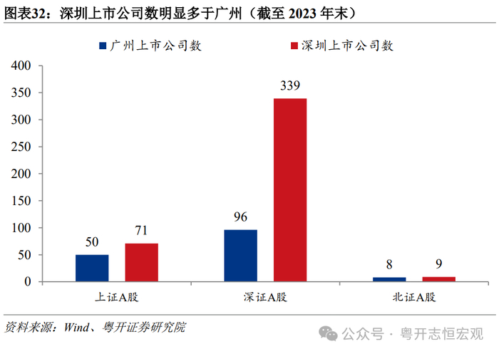 深圳集中了大量的上市公司。截至2023年末,沪深两市及北交所合计5356家A股上市公司中,广州有154家,深圳则达到419家,分别占全省的17%、48%。分板块看,广州有三分之二的A股上市企业在深圳上市,三分之一在上海上市,而深圳80%的A股上市企业在深圳上市,17%在上海上市。