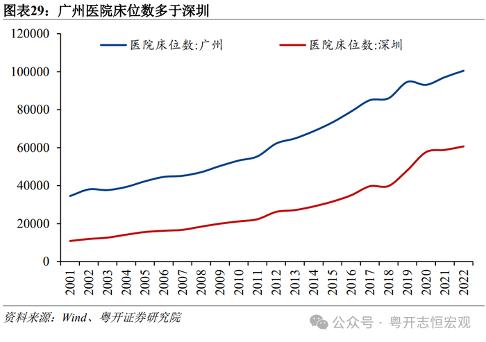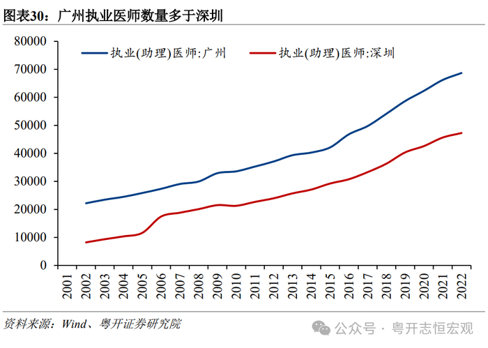 广州医疗卫生资源优于深圳。2010年至2022年,广州、深圳医院数量分别从216、107家提高到298、151家,其中三甲综合医院20、15家,医院床位从5.3、2.1万张提高到10、5万张。卫生技术人员从9.6、5.6万名提高到19.6、11.8万名,其中执业医师从3.4、2.1万名提高到6.9、4.7万名,常住人口每万人医师数为36.6、26.4名。