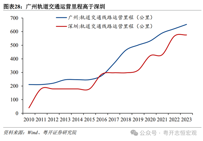 第六,与深圳相比,广州基础设施和公共资源较为充足,为城市的宜居环境提供支撑,进而有望吸引劳动者前来定居和工作,或能够成为人口集聚、产业发展、经济繁荣的重要支撑。广州的交通、教育、卫生等公共资源总量与人均资源普遍优于深圳。交通方面,广州、深圳高速公路里程分别为1133、397公里,全市货运量分别为9.1、4.1亿吨,全市客运量分别为1.7、1亿人次,市政道路面积分别为2.2、1.5亿平方米。教育方面,广州集聚了全省过半高校(84家),深圳仅有10家。卫生方面,广州和深圳分别有298、151家医院,其中三甲综合医院20、15家,执业医师6.9、4.7万名,常住人口每万人医师数36.6、26.4名。