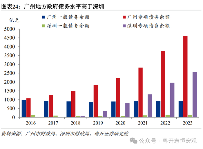 广州对土地财政依赖程度高于深圳。以国有土地出让权收入/(政府性基金收入+一般公共预算收入)来衡量广深对土地财政的依赖程度,2023年广州、深圳土地财政依赖度分别达到45.5%、17.6%。