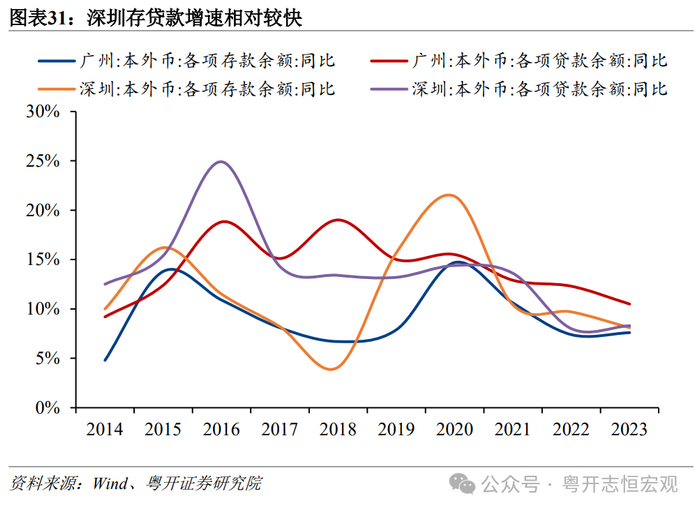 深圳的市场主体信贷活动较广州的市场主体更活跃。存贷款方面,深圳存贷款余额、增速高于广州。从规模看,2023年广州、深圳金融机构本外币存款余额分别为8.7、13.3万亿元,贷款余额分别为7.7、9.2万亿元,广州分别为深圳的65%、83%。从增速看,2010至2023年广州、深圳存款余额复合年均增长10.4%、14.9%,贷款余额复合年均增长12.7%、14%。