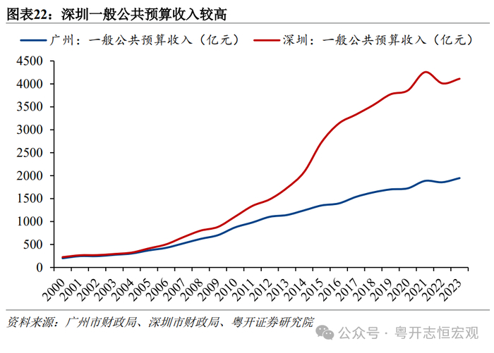 广州财政自给率处于全省中上游,深圳则为全省第二。2000年至2023年,广州、深圳全市一般公共预算收入分别从200.5、221.9亿元增长到1945.1、4112.9亿元,年均增长10.4%、13.5%,一般公共预算支出分别从240.7、225.6亿元增长到2971.6、5012.4亿元,年均增长11.5%、14.4%。从人均看,广深人均一般公共预算收入从0.2、0.32万元增长到1.0、2.3万元,人均一般公共预算支出从0.24、0.32万元增长到1.6、2.8万元。广州财政自给率从83.3%降至65.5%,深圳则从98.4%降到82.1%,目前分别全省第六、第二。其中,广州和深圳税收收入占一般公共预算收入的比重分别为70.4%、84.3%,财政收入质量良好。