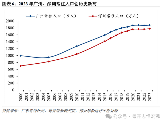 随着我国城市化进程推进,人口进一步向一线城市集聚,尤其是深圳常住人口总量快速上升。2000年至2023年,广深常住人口分别从995、701万人增长到1883、1779万人,年均增长2.8%、4.1%。深圳常住人口从相当于广州常住人口的70%上升到广州的94%。
