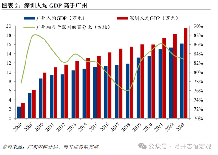 深圳建市以后经济飞速发展,经济规模逐步赶上广州。2000年,深圳GDP规模相当于广州的89%,2010年则达到广州的95%。根据第四次经济普查(以下简称四经普)数据修订后的GDP数据显示,2012年深圳GDP首次超过广州,并保持领先至今。这一时间点早于过去普遍认为的2017年。2018年,广深差距达到极大值,广州GDP相当于深圳的83%。此后广深差距重新收窄,2023年广州GDP相当于深圳的88%。从人均看,广州人均GDP一直低于深圳,2023年广州人均GDP为深圳的83%,与2018年的76%相比,差距亦有收窄。