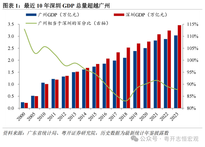 1、经济总量:2012年深圳GDP总量超越广州,2018年后差距重新有所缩窄