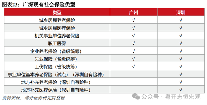 得益于经济发展与人口持续流入,广深社保基金预算可持续性良好,均实现当年结余。目前,广州、深圳社保基金包括7个全国险种,其中企业职工基本养老保险基金和工伤保险基金已实现省级统筹。此外,深圳社保基金中另有3个自有险种。2020年,广州社保基金预算收入、支出、当年结余为977、789、188亿元(不含省级统筹险种,下同),深圳为1107、623、484亿元,如按可比口径(不计3个深圳自有险种)则深圳为1017、588、429亿元,深圳社保基金规模稍高于广州。从累计结余看,广州、深圳社保余额较充足,2023年社保基金累计余额分别为1906、2992亿元。以累计结余与当年基金支出之比衡量社保基金可持续性,2023年末广深社保基金累计结余可持续月数为29、57.6个月。