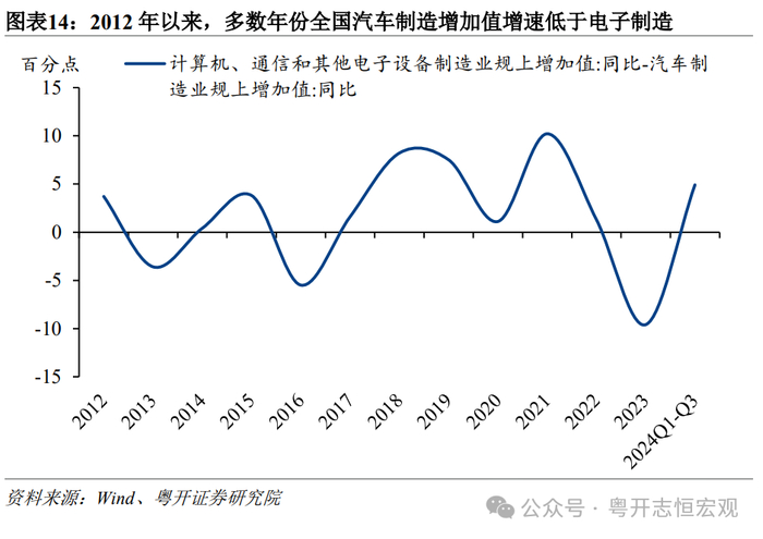 第一,深圳依赖电子“一业独大”,而广州依靠汽车、电子、化工三大支柱,产业面临的宏观环境不同,或导致了广深工业走势的差异。近年来,全球数字化进程加速,信息技术不断进步,电子产品需求高速扩张,汽车消费虽然也呈现快速增长,但仍受到一些因素影响,如全球汽车产业向新能源变革,技术升级和市场需求步伐减慢。面对汽车产业的瓶颈,广州须主动寻求产业转型,而转型期间也必然面临“阵痛”。此外,广州化工业比重较高,而化工面临的环保约束趋于严厉,对广州工业也带来了一定影响。
