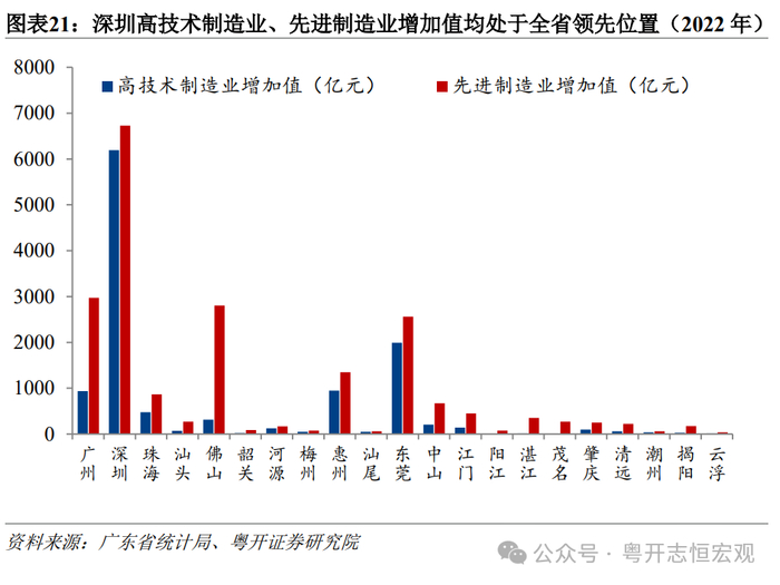 全省高技术制造业、先进制造业集中于深圳,广州基础相对薄弱。2022年,深圳规上高技术制造业增加值占全省的61.3%,超过其余20个地级(副省级)市之和,且占本市规上工业的60%以上,而广州落后于东莞、惠州,仅为全省第四,占本市规上工业的19%。广州与深圳差异巨大,主要原因是在广州产业结构中占比较大的传统燃油汽车、石化属于传统产业,而非高技术产业。如按照广东省制订的先进制造业口径(包括电子、装备、石化、轻纺、材料、医药六大产业),广州、深圳先进制造业分别占全省的14%、33%,占本市规上工业比重则为61%、67%。