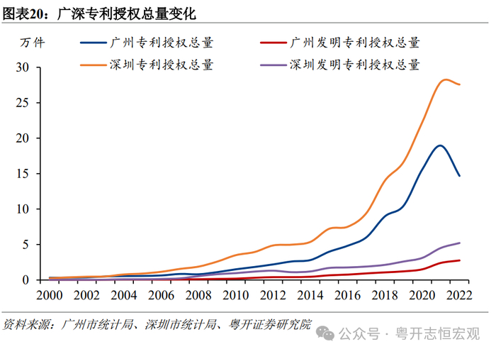 广州专利授权量与深圳差距较大,全部专利和发明专利授权量约为深圳的三分之二和一半。2022年,广州、深圳全市专利授权总量达到14.7、27.6万件,广州相当于深圳的53%,其中发明专利授权量分别为2.8、5.2万件,广州相当于深圳的53%。