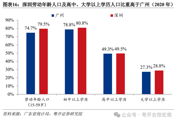 从结构看,深圳在高学历劳动者方面优势突出。第七次人口普查数据显示,广州、深圳劳动年龄人口占比为74.7%、79.5%(全省平均68.8%),老龄化率(65岁以上占比)分别为7.8%、3.2%(全省平均8.6%)。大学以上学历人口比重达到27.3%、28.8%(全省平均15.7%),高中以上比重49.3%、49.5%(全省平均33.9%)。