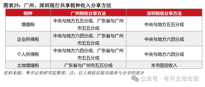 增值税、企业所得税、个人所得税、土地增值税四个税种对于各级财政都极为重要,我们测算四个税种(增值税和企业所得税仅包括分享部分,下同)占到广州(深圳)创造的中央及省级收入的55%(48%),占广州(深圳)全市一般公共预算收入的50%(69%)。下面举例说明我们的测算方法。广州的增值税(分享部分)由中央、广东省、广州市分享50%、25%、25%,深圳则是中央与深圳市五五分成。根据2019年决算中广州、深圳全市增值税收入430、1164亿元,我们测算广州贡献中央和省级增值税收入(分享部分)1290亿元(中央和省级分别为860、430亿元),而深圳贡献中央级增值税收入(分享部分)1164亿元。