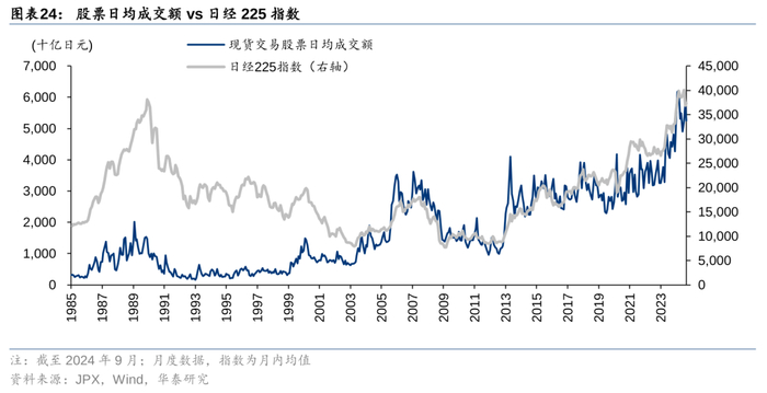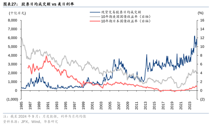 40年的长周期中,利率和股票市场交投活跃度负相关。利率和成交在短期看并没有十分明显的相关性,二者的关系需要放到长周期中考量,但在1985-2024年9月的长周期中,美债和日债利率不断走低,货币政策整体趋向宽松,日本股市的日均成交额则不断提升。