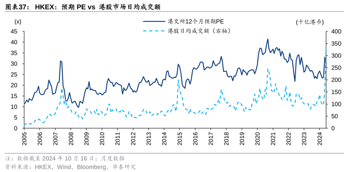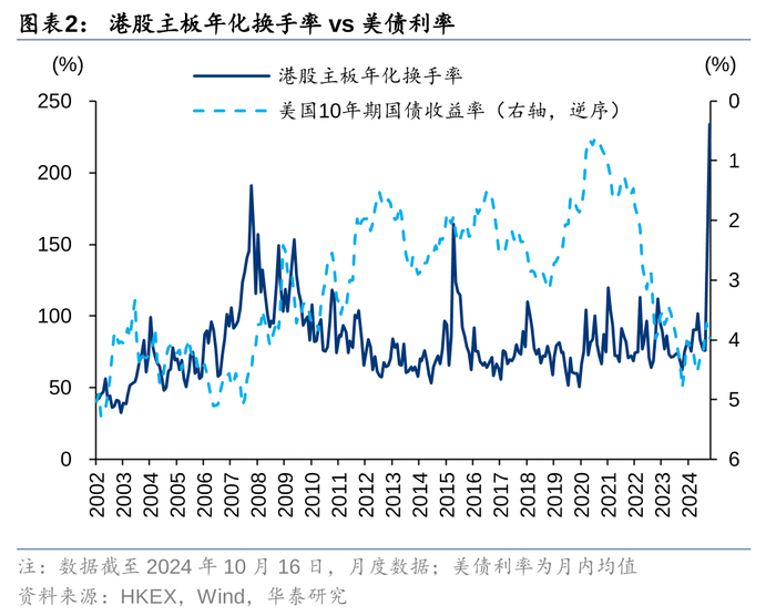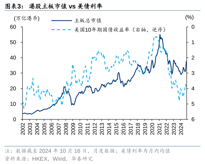 2024年美债利率已经从高点回落,联储在9月降息50bp,全球高息的压力部分释放,未来联储有望持续降息,或将支撑香港股市的成交额。