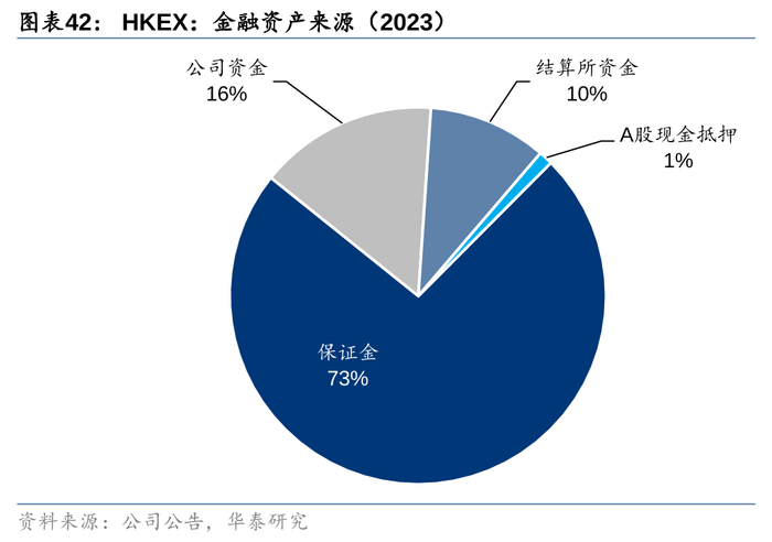 港交所的投资资金主要来自保证金、结算所资金和公司资金。截至2023年末,保证金占比73%,结算所资金占比10%,公司资金占比16%。另外还有A股的现金抵押,但占比较小。