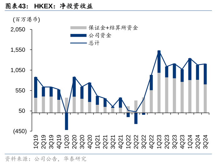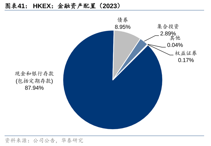 投资以定期存款为主。港交所的金融资产主要投资于定期存款以及风险较低的债券,另外还有部分集合投资(委外投资)以及权益证券,但占比较少。具体来看2023年末,保证金中的约20%投资于隔夜存放,约8%投资于投资级债券,72%投资于不超过12个月的定期存款(平均久期约10个月)。结算所资金则大部分用于隔夜存放或投资香港金融管理局发行的外汇基金票据。公司资金中,19%用于委外投资,内部组合中的大部分是定期存款或现金。