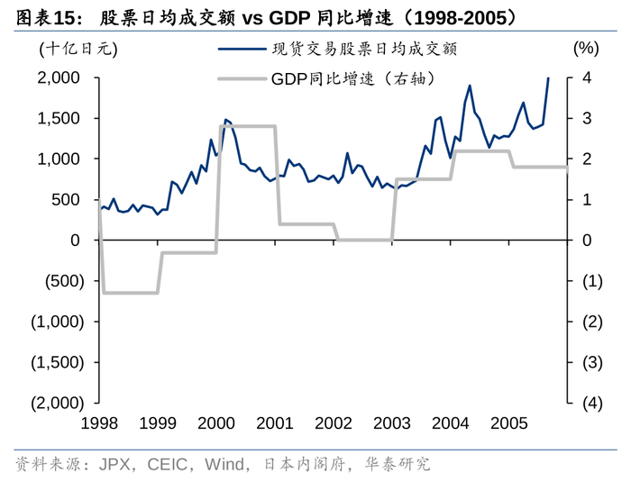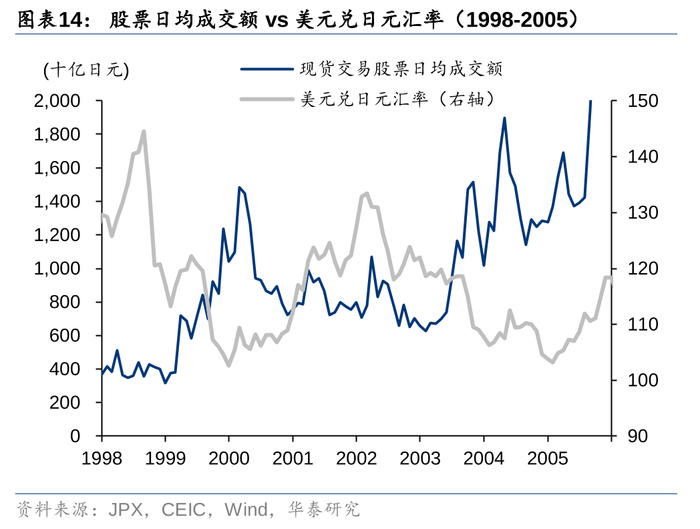 另外我们注意到1998-2005年日股成交额和美日汇率有一定的负相关性,这主要是因为这段时间日本国内和全球宏观经济的变化不同步,而且外资在日本股市的成交额和市值中的占比仍在提升。例如1998-2000年,日本成交额提升的同时日元升值,这是因为在这段时间日本开始了财政政策的第三轮扩张,同时货币政策开启零利率时代,推动日本股市市值上涨,进而带动成交额;然而这一时期同时也发生了亚洲金融危机、LTCM倒闭导致全球金融市场波动等事件,导致的避险情绪驱动资本流入日元资产,推升了外资在日股中的重要性,使得日本宽松的货币和财政政策没有体现在美日汇率上。另外2002-2005年也出现了成交额上涨但日元升值的情况。成交额上涨是因为小泉上任并推行一系列结构性改革措施,GDP增速提升,推动股市上行,市值提升,进而带动成交额。同一时期日本利率环境相对稳定,但美联储开启降息,美日利差收窄,导致日元升值。