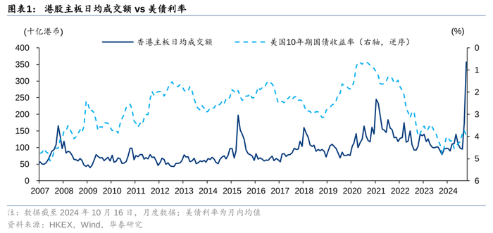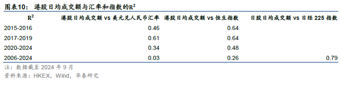 2020年到2024年9月,美债利率和港股日均成交额之间的为0.27(2007-2019 = 0.005),说明2020年后港股成交额27%的波动能够由美债利率解释,二者存在一定的相关性。