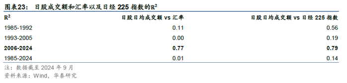 至于成交额的另一个变量换手率,一直以来波动较大,且长期看表现出相对独立的走势,与美债利率、人民币汇率以及股指关联性都不明显,这一点与后面提到的日本股市类似。可能换手率更多是反映投资者的行为模式,而行为模式长期看有一定稳定性。