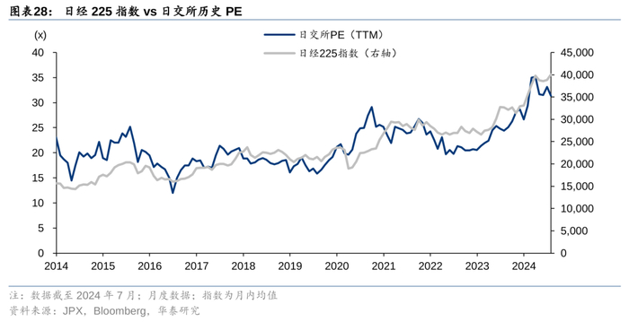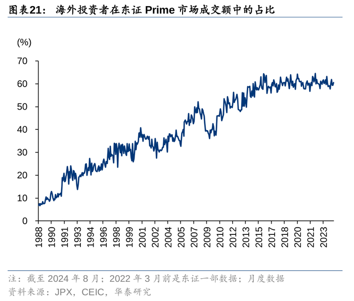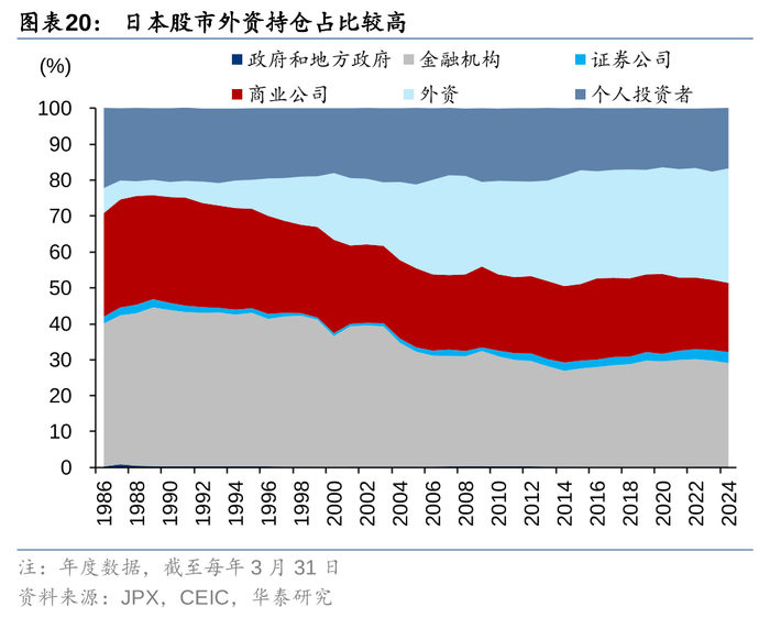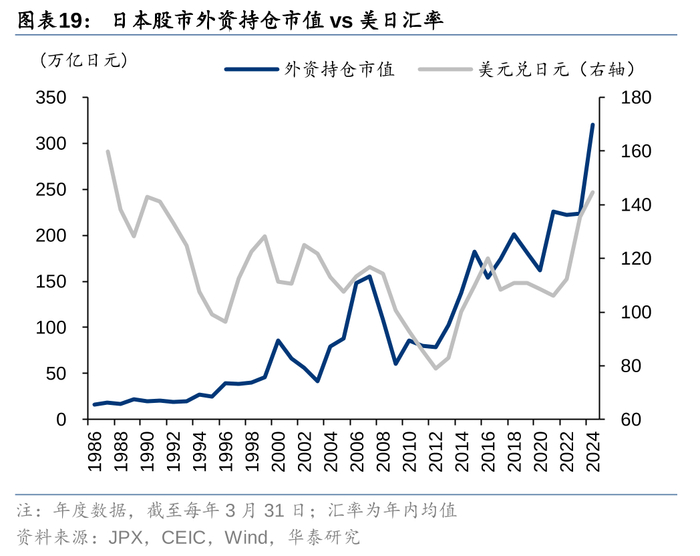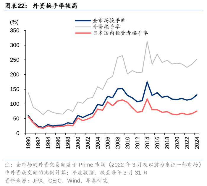 2013年至今,日元处于贬值通道,外资成交额和持仓占比稳定在较高水平。约60%的日股成交额来自外资,原因是外资的换手率和持仓较高。3M23-3M24,我们测算的外资换手率约252%,是日本当地投资者75%换手率的近3.3倍。外资的持仓占比同样是所有投资者中最高,截至3M24,外资持仓市值达到320万亿日元,占比31.8%,高于本地金融机构的28.9%。