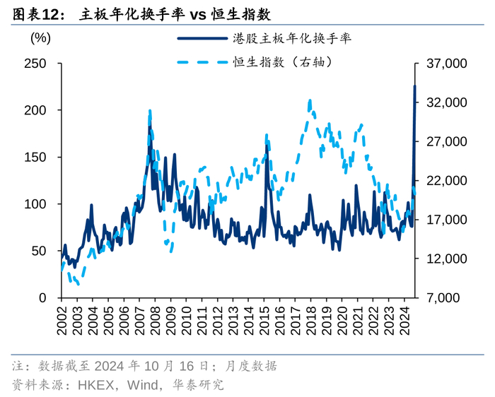 换手率是决定成交额的另外一个变量,港股的换手率波动较大,年化主要集中在50%-100%之间,在部分年份超过150%,与美债利率的相关性不强,或许和港股主要投资者的投资风格有关。