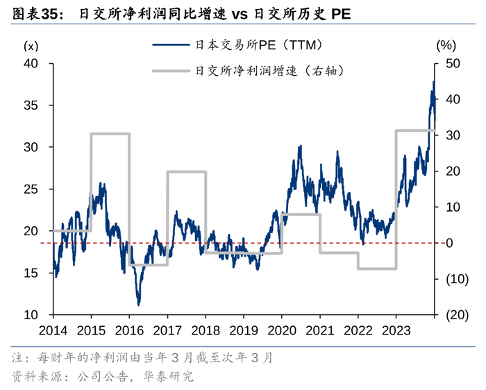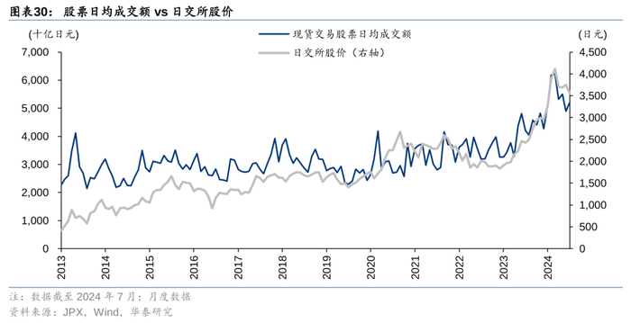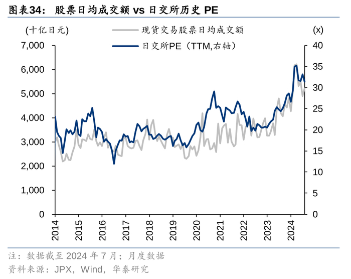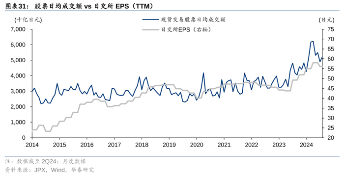 2013年以来,日本交易所股价与市场成交额联动,市场成交额通过影响日交所的EPS和估值来影响日交所股价。日交所是日本资本市场的基础设施,直接受益于市场交易热情的提升,不仅能够获得更高的估值,也能录得更高的盈利。日交所股价的上涨由EPS和PE双轮驱动,其中EPS的贡献更大,2014-7M24,日交所股价上涨275%,1Q24-2Q24的TTM EPS的涨幅为133%,大于TTM PE的涨幅61%。