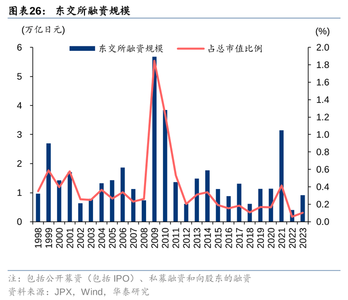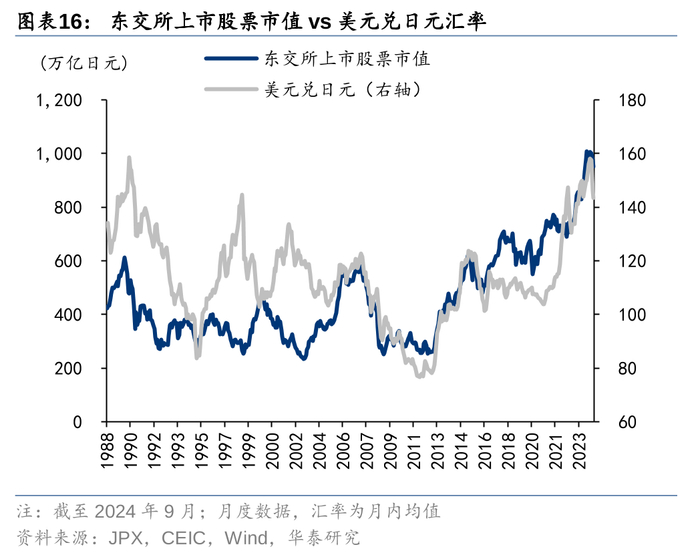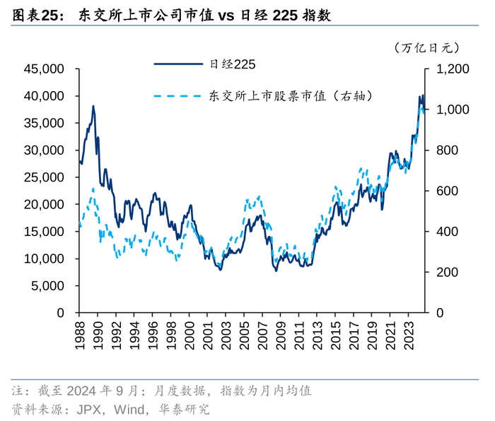 日经225指数和日股市值相关性强,二者几乎可以画等号。股指代表的是市场主要上市公司的股价,而股市总市值的上涨既有可能是由于股价上涨,又有可能是因为市场新增融资规模增加。从1988年到2024年9月的长周期中,日经225指数与东交所上市公司总市值表现出较强的相关性,主要原因是期间日本股市新增上市公司少,并且日经225指数代表性强。