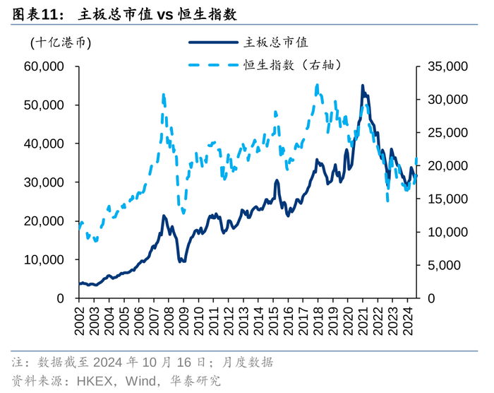 港股总市值不仅仅依赖股价(股指)变动,新的融资也是重要因素。恒指和港股市值之间的相关性相对日股更弱。主要原因有两个,其一是香港市场在周期内新上市的公司市值多于日股,而股指主要反映股价的变化,因此股指(股价)对整体市值变化的贡献小于日股;其二是日经225指数的成分股覆盖可能比恒指更全面,日经指数涵盖了日股225只有代表性的企业,而恒生指数仅有82只,因此日经指数对全市场股价变动的反映更充分。