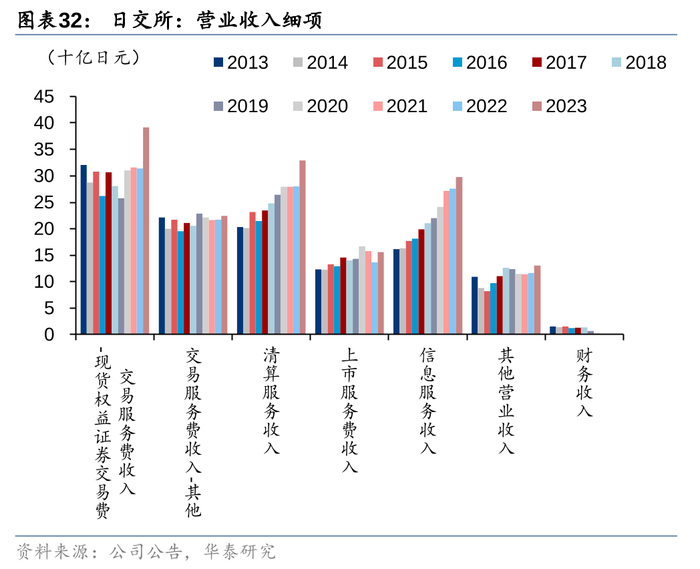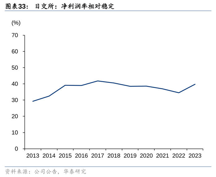 成交额波动影响盈利。日交所的收入主要由交易费-现货、交易费-其他、清算费、上市服务费、信息服务费和其他构成。2013-2023年,现货交易费收入是波动最大的一项,清算和信息服务费收入有增长趋势,其中清算服务收入的波动性很大程度上也来自现货成交额的波动,其余收入则相对平稳。可以说,过去10年,成交额的波动是导致日交所收入波动的主要原因,同时也是推动日交所收入在2023年增长的重要原因。另外我们发现2015年后,日交所的净利润率稳定在40%上下,这意味着收入的波动会直接传导到净利润。