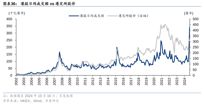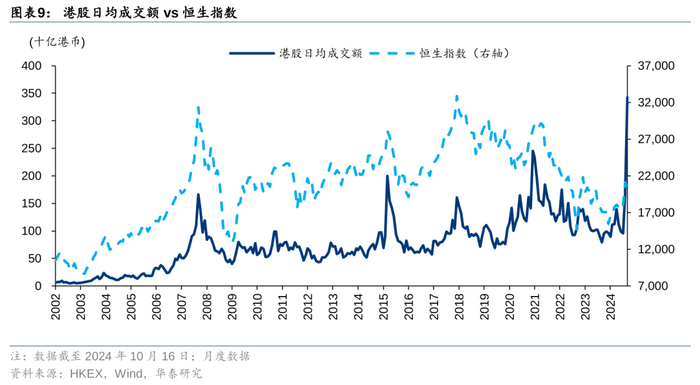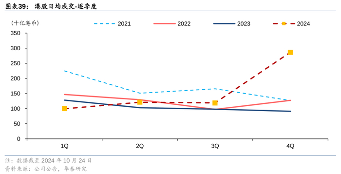 在联储降息和内地政策组合拳的双重加持下,9月底到10月中旬港股市场高歌猛进,10月8日的单日成交额达到6,207亿港币,创下港股市场历史新高。3Q24的日均成交额快速回暖,由此前的900-1,000亿港币提升至1,188亿港币,4Q24的日均成交额截至2024年10月24日是2,945亿港币。