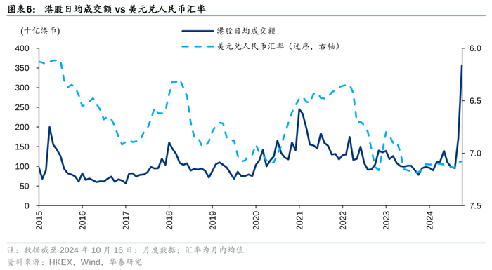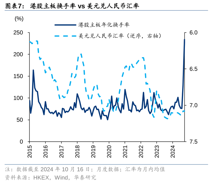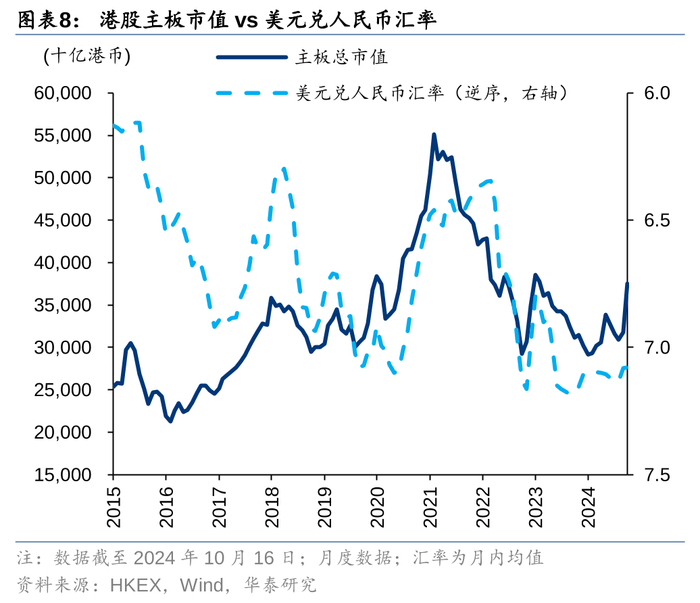 美债利率和港股成交额长期看存在负相关性,且2020年后进一步增强。港股市场高度开放,美债利率可用来衡量全球流动性的充裕程度,并且在联系汇率制度下,美联储降息将推动香港基础货币和货币供应扩张,进而提升港股市值和成交额。美债利率影响人民币汇率,汇率也与港股成交额相关。人民币升值会拉高港股上市公司的盈利预期,提升全球投资者投资港股的兴趣,进而促进港股成交。另外人民币兑港币升值也会提升香港地区的流动性。利率和汇率与港股市值相关性强,而换手率波动较大,与利率和汇率的相关性弱。
