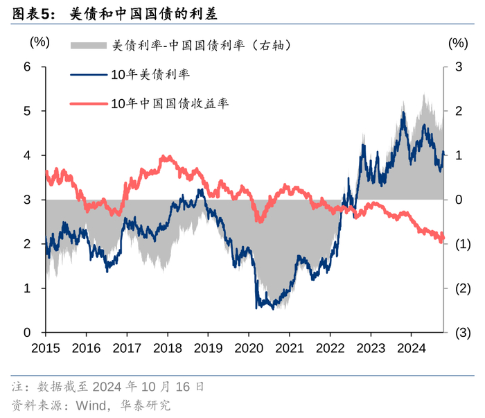 美中利差和美元兑人民币汇率联动。汇率是货币的价格,受到全球宏观形势、国家金融政策、地缘政治等多种因素的影响,其中汇率双方国家的利率环境是十分重要的影响因素,高利率国家的货币往往更紧俏,因此通常相对低利率国家的货币升值。在2021年后,人民币汇率和美中利差之间的相关性十分明显,10年美债和10年国债的利差拉大时,人民币汇率往往有所回落。