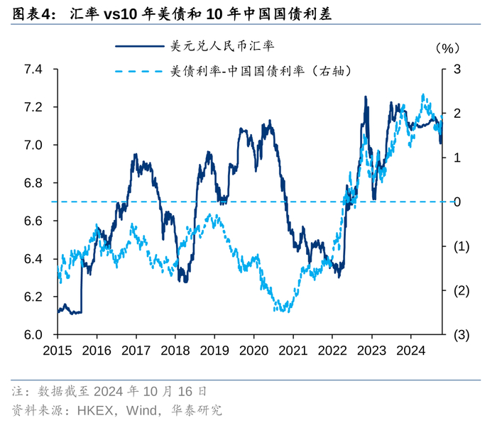美债利率主导中美利差。由于中国国债利率波动较小,美债利率长期主导了中国和美国的利差,而利差影响汇率。后文我们会提到汇率与港股市值以及成交额之间的相关性,我们认为美债利率能够通过汇率间接影响港股成交额,这进一步加强了利率和成交额之间的联系。