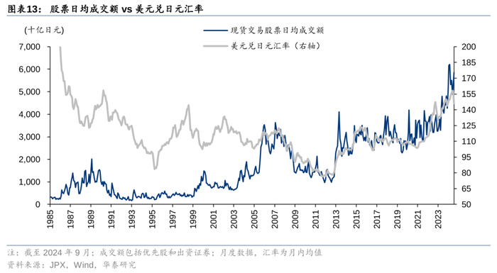日元升值时期的主题是全球金融危机及其后的复苏,日元作为避险货币大幅升值,股市成交在这一时期快速收缩,日均成交额由3万亿日元降至1万亿日元。贬值周期始于安倍政府上台,开始实施一系列被称作“安倍经济学”的经济政策,包括货币宽松、财政刺激和结构性改革,期间日本股市的成交额也与美日汇率保持了相当强的正相关性。贬值周期可以进一步分为不同的阶段,在初期(2013年),日元迅速贬值,投资者的交易热情快速提升。在中期(2014-2020年),汇率基本维持稳定,市场日均成交额维持在3万亿。在后期(2020年至今),在美联储加息背景下,日元再次加速贬值,日均成交额快速提升至2024年9月的5.26万亿日元。