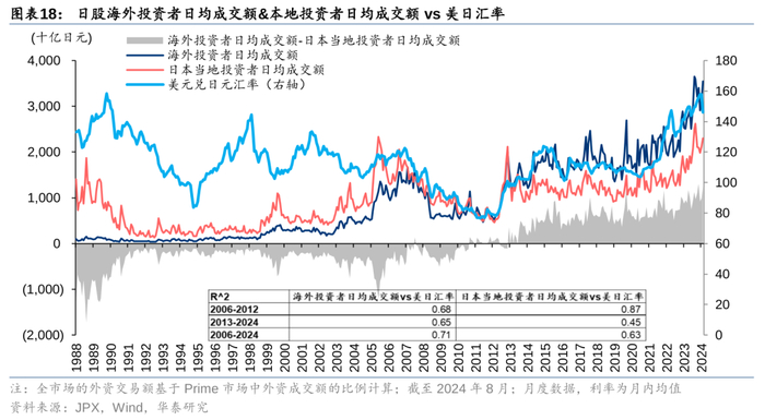 相较于本地投资者,外资更活跃,贡献了更高的日均成交额,且与汇率展现出更强的相关性。2006-2024年8月,海外投资者的日均成交额与美日汇率之间的是0.71,说明外资日均成交额71%的波动能够由美日汇率解释,二者的相关性较强。相比之下,日本本地投资者的日均成交额和汇率之间的相对较小,为0.63。另外值得注意的是,在2013年之后,外资的变化不大,而本地投资者的大幅下降,由高于外资的0.87降低至低于外资的0.45,这个降幅是非常显著的。可以说2006年后日股全市场的成交额与汇率之间相关性的来源逐渐由本地投资者转变为海外投资者。