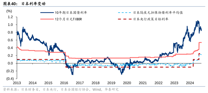 外资成交额与美日汇率的正相关性是全市场成交额与汇率之间具有正相关性的主要原因。日元贬值往往伴随外资持仓上涨和外资成交额上涨,而外资在日本股票交易中又占据主导地位,2013年以来成交占比约60%,因此外资成交额上涨也会推动总成交额上涨,这使得美日汇率与日股总成交额具有正相关性。2024年7月后日元升值,但9月后又继续贬值,未来若日元持续走弱,根据历史经验,可能利好日股的交投活跃度。