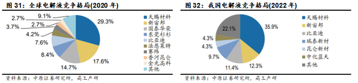 高工产研统计显示:我国电解液企业在全球已具备较强竞争力,全球主要电解液企业包括天赐材料、新宙邦、瑞泰新材等。天赐材料2022年全球市场占比35.9%,相比2020年提升6.6个百分点。