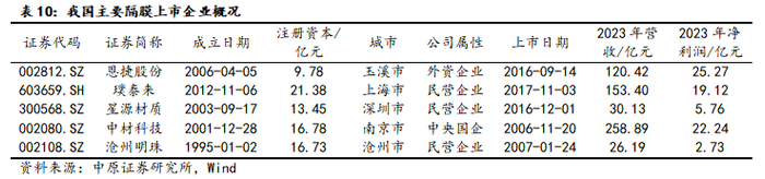 行业内主要企业分为国内企业和国外企业,国内湿法隔膜企业主要有恩捷股份、星源材质、中材科技、沧州明珠、璞泰来等;国外湿法隔膜企业主要有日本旭化成、韩国 SKI、日本东丽。万得统计显示:我国隔膜主要上市企业包括恩捷股份、璞泰来、星源材质、中材科技和沧州明珠。