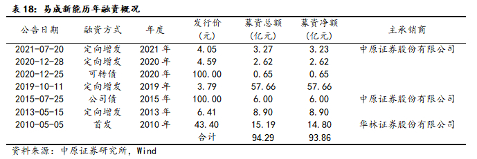 易成新能2010年上市以来合计融资6次,其中可转债方式2次、定向增发方式4次,包括首发在内累计募集资金净额93.86亿元。