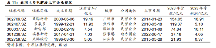 万得统计显示:我国锂电池电解液主要上市企业包括天赐材料、多氟多、新宙邦、瑞泰新材和天际股份。