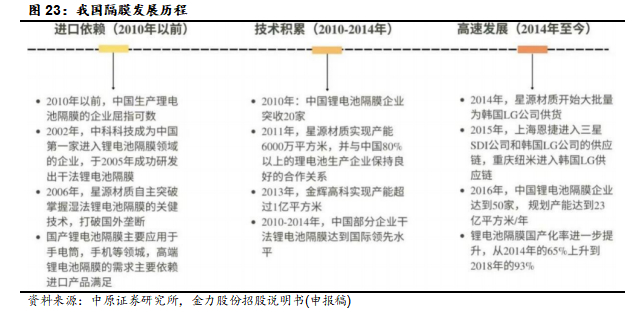 由于我国隔膜行业起步时间较晚,加上国外先进企业长期的技术垄断与封锁,锂电池隔膜成为最后一个实现国产化的锂电池关键材料,其发展大致可分为三阶段:2010年以前的进口依赖、2010-2014年的技术积累,以及2014年至今高速发展,其中到2017 年末,国内隔膜市场已基本实现国产化,并逐步打开海外市场,且全球市场占比显著提升。
