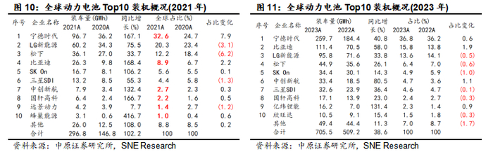 结合SNE Research统计显示:我国动力电池在全球已具备较强竞争力和显著优势,其中宁德时代连续稳居全球第一,2023年宁德时代动力电池全球市场占有率36.2%,较2020年的24.6%显著提升11.6个百分点;全球动力电池Top10中,我国动力电池有6家企业入围、韩国3家企业入围、日本1家企业。其中,我国动力电池企业全球市场占比持续提升,2023年我国6家入围动力电池企业合计占比63.5%,合计市场占比较2020年的38.4%提升25.1个百分点。