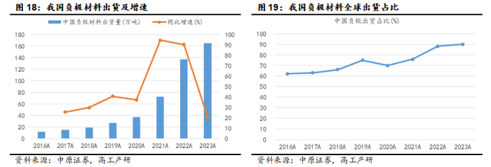 伴随我国锂电池出货量增长,锂电池对应四类关键材料需求亦增长,具体至锂电池负极材料:2016年,我国负极材料出货11.8万吨,2023年出货大幅增至165万吨,2023年同比增长20.44%,2016-2023年期间年均复合增长率45.8%。我国负极材料全球占比总体持续提升,2016年全球占比62.11%,2016年以来我国负极材料全球出货占比总体持续提升,2023年约90%,创近年来的历史新高。结合我国锂电产业链全球竞争优势,预计未来占比总体将维持高位。结合锂电池下游需求,预计我国负极材料出货仍将保持两位数增长。