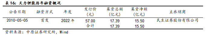 2009年3月,李树群、李玉刚等四人同意设立天力有限,设立时注册资本为300万元,成立初期主要从事锌粉、储氢合金研发与生产,同时进行三元材料及前驱体的开发与研制。公司三元材料业务自2013年起成为公司主要收入来源,在主营业务收入中的占比超过75%;2015年,公司整体变更为股份有限公司并挂牌新三板。2022年6月,证监会同意新乡天力锂能股份有限公首次公开发行股票,首发融资募资净额15.50亿元,主要投向三元正极材料项目和补充流动资金。