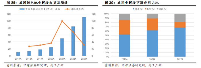 高工产研统计显示:2017年,我国锂电池电解液出货11万吨,2023年大幅增至111万吨,2017-2023年期间年均复合增长率为47.0%。下游应用方面,动力和储能锂电池用电解液占比总体持续提升,2022年动力用电解液占比68%、储能用电解液占比19%,预计该趋势仍将持续。