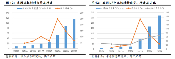 伴随我国锂电池出货量增长,锂电池对应四类关键材料需求亦增长,具体至锂电池正极材料:2016年,我国正极材料出货17.70万吨,2023年大幅增至248万吨,较2022年同比增长30.53%;2016-2023年期间年均复合增长率为45.81%。不同正极材料而言,磷酸铁锂正极材料出货持续高增长,2017年我国磷酸铁锂出货5.91万吨,2023年增长175万吨,期间年均复合增长率为74.17%,显著高于我国正极材料年均增长水平;磷酸铁锂出货在我国正极材料中的占比持续提升,2017年LFP出货占比27.62%,2023年占比66.53%。其他主要正极材料,2023年三元材料出货65万吨,同比增长1.56%,在我国正极材料中占比26.21%;钴酸锂出货8.40万吨,同比增长9.09%,占比3.39%。