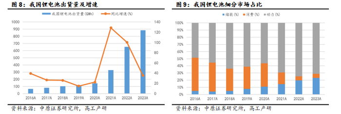 伴随产量增长,我国锂电池产业规模呈现高速增长趋势。工信部统计显示:2016年我国锂电池产业规模为1330亿元,2022年首次突破万亿元达1.2万亿元,2016-2022年市场规模年均复合增长率44.3%,显著高于行业产量增速,主要系近年来动力电池和储能电池增长更快且单位产值更高;2023年行业规模达1.4万亿元,持续保持在万亿元以上。增长率方面,2016-2019年增速总体呈现下降趋势,2020年以来增速显著提升,其中2022年同比实现翻倍增长,主要系我国新能源汽车高增长且我国动力电池产业链优势显著,2023年同比增长16.67%,增速较2021-2022年显著回落,主要系2023年产业链价格显著承压。