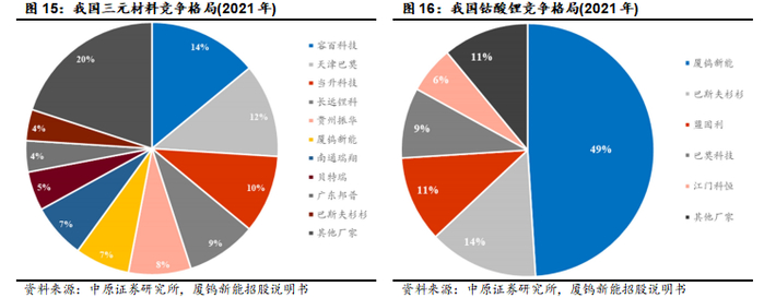 钴酸锂正极材料主要企业包括厦钨新能、巴斯夫杉杉、盟固利、巴莫科技以及江门科恒,2021年出货前三的分别是厦钨新能、巴斯夫杉杉和盟固利,且钴酸锂行业集中度较高,厦钨新能优势较为显著。